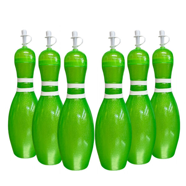 This pack of bowling pin water bottles comes with six green bottles with straws and tip.